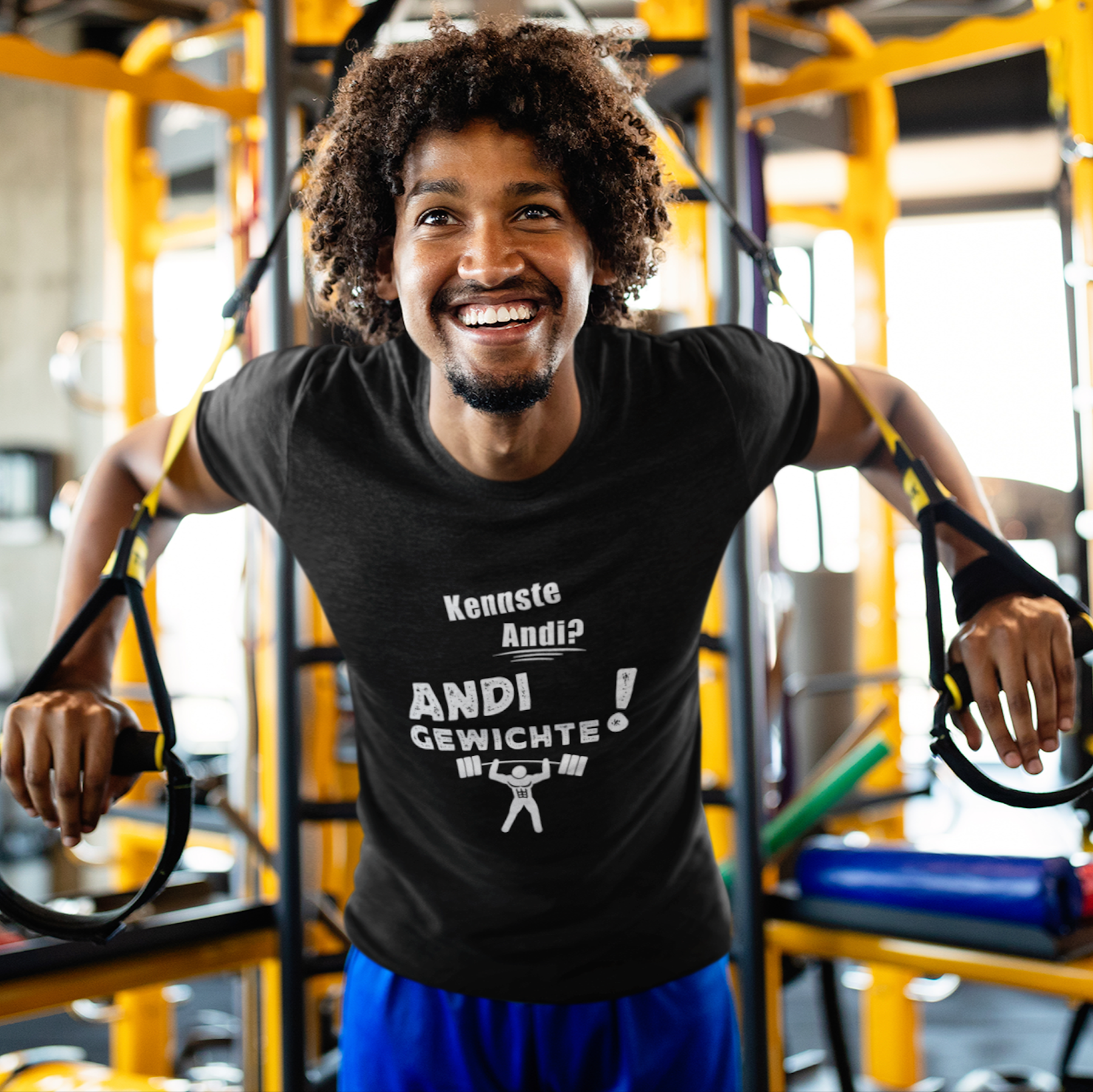 Dieses Gym-Shirt ist perfekt für alle, die Humor und Fitness kombinieren möchten. Mit dem witzigen Spruch "Kennste Andi? ANDI GEWICHTE!" setzt du im Gym ein Statement und sorgst garantiert für ein Schmunzeln bei deinen Trainingspartnern. Dank der hochwertigen Verarbeitung aus 100% Baumwolle bietet das Shirt ein angenehmes Tragegefühl und optimale Atmungsaktivität – ideal für intensive Workouts oder entspannte Tage. Die Passform sorgt für Bewegungsfreiheit beim Training, während der modische Kragen und die robusten Doppelnähte an Ärmeln und Bund das Shirt langlebig und strapazierfähig machen.