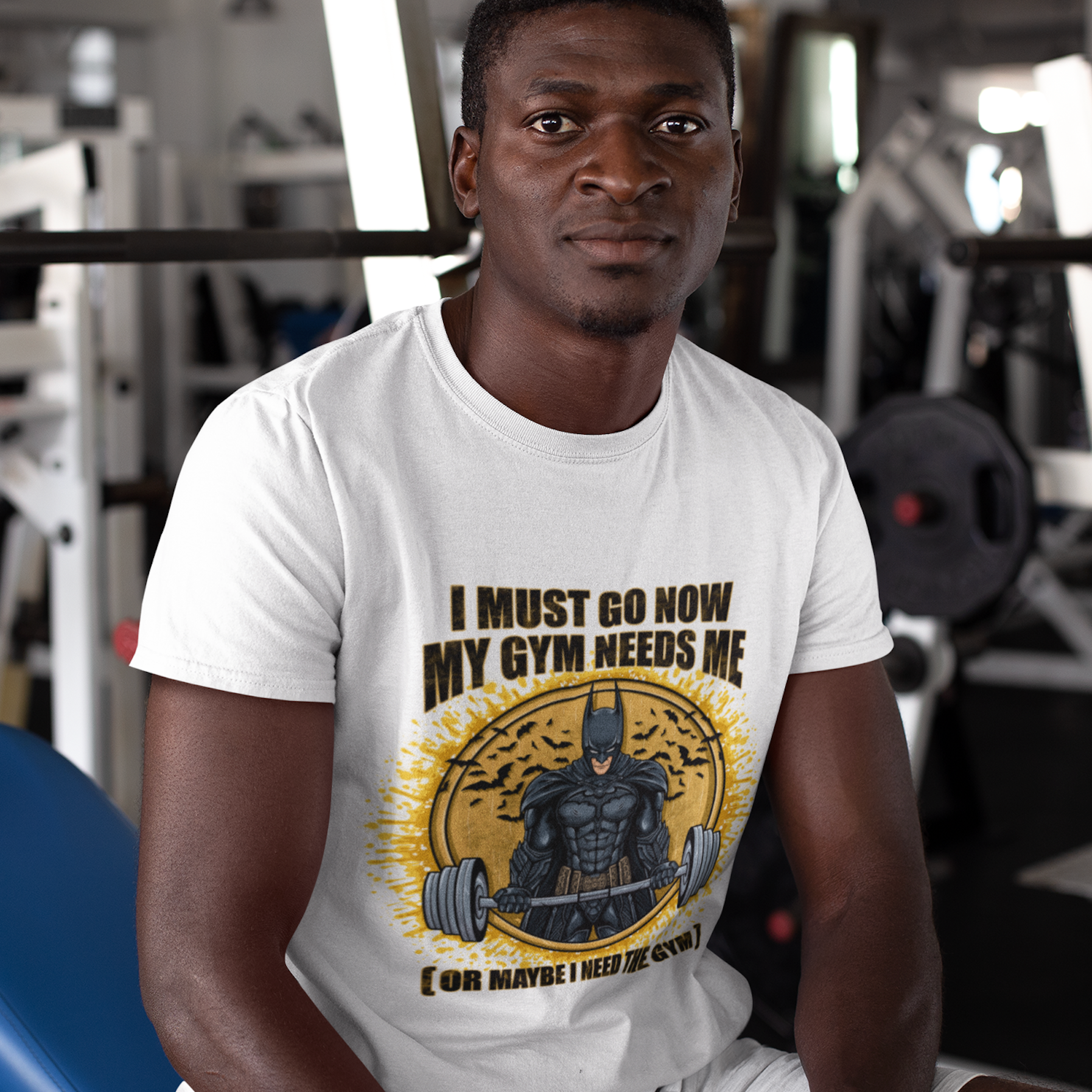 Unser Premium-T-Shirt ist ideal für alle Fitnessfans, die ihre Leidenschaft für das Training mit einem Hauch von Superhelden-Style kombinieren möchten. Das hochwertige Shirt aus 100% Baumwolle besticht durch ein einzigartiges Batman-Design, das den Dunklen Ritter beim Heben von Gewichten zeigt, begleitet vom motivierenden Spruch: "I must go now, my gym needs me (or maybe I need the gym)". Mit einer angenehmen Stoffdicke von 180 GSM bietet es nicht nur optimalen Komfort, sondern auch die nötige Strapazierfähigkeit für intensive Workouts.