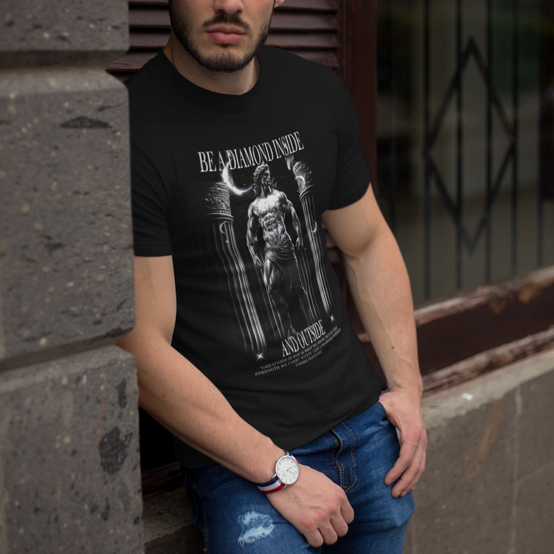 Das "Be a diamond inside and outside" T-Shirt ist dein perfekter Begleiter im Gym. Der kraftvolle Print einer muskulösen Statue und der motivierende Spruch erinnern dich daran, dass wahre Stärke von innen kommt – wie ein Diamant, der unter Druck geformt wird.