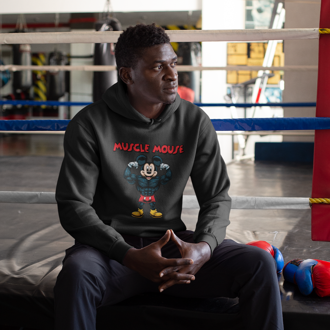 Das auffällige „Muscle Mouse”-Design kombiniert Humor und Power – ein echter Hingucker für jeden, der im Gym ein Statement setzen möchte. Die Kapuze mit Kordelendstücken aus Metall sorgt für zusätzlichen Premium-Look und Stabilität.